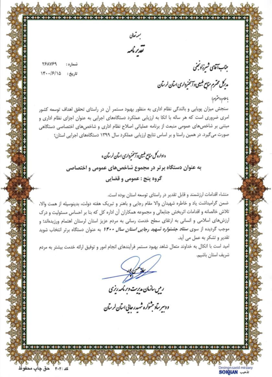 پیام تقدیر و تشکر مدیرکل منابع طبیعی و آبخیزداری لرستان به مناسبت عنوان دستگاه برتر اداره کل منابع طبیعی و آبخیزداری استان در ستاد جشنواره شهید رجایی سال ۱۴۰۰