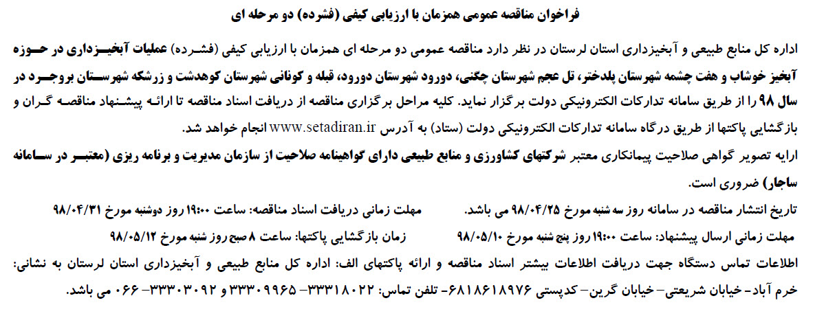 فراخوان مناقصه عمومي همزمان با ارزيابي كيفي (فشرده) دو مرحله اي